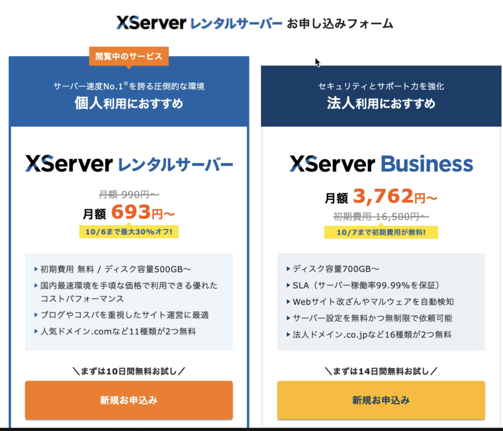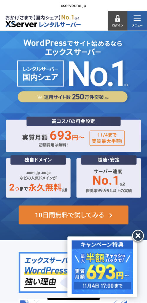エックスサーバー にアクセスすると、「お申し込み」または「10日間無料で試してみる」というボタンをタップで進みます。