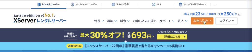 エックスサーバーのwebサイトにアクセスし、「お申し込み」ボタンをクリック