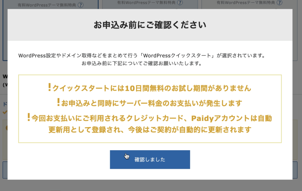 お申し込みの前に注意事項が表示される場合は、内容を確認後進みます。