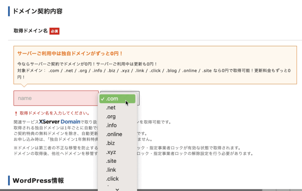取得したいドメインを入力し、末尾のドメインをセレクトボックスから選びます。