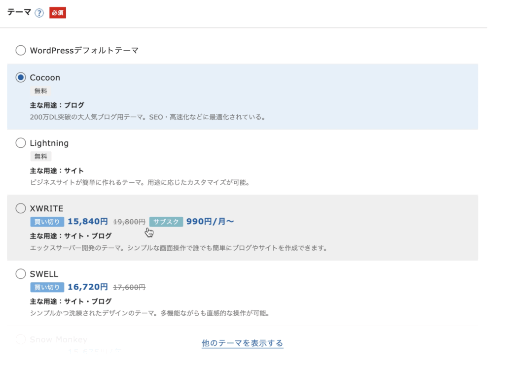 登録したいユーザー情報を入力すると、WordPressテーマをここで選択(テーマによっては購入)します。