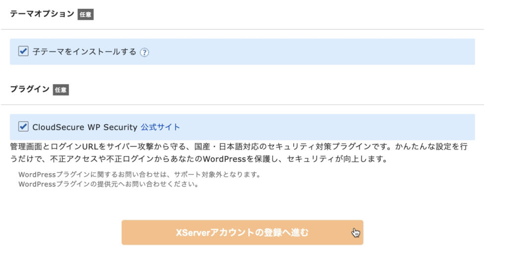 最後に、「子テーマのインストール」とプラグインにチェックを入れたら『X Serverアカウントの登録へ進む』をクリックします。